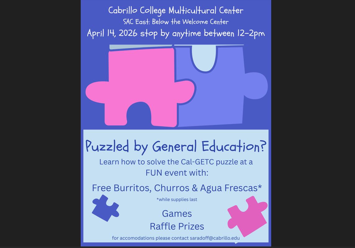 Come learn about the Cal-GETC General Education pattern at an event in the Multicultural Center on Tuesday, April 14, anytime between noon-2:00 p.m. In this quick interactive activity, students and faculty will solve the puzzle of fulfilling all the Cal-GETC GE requirements. Burritos, churros, and aguas frescas will be available (while supplies last), with raffles every 30 minutes. Don't miss this chance to learn essential information that may transform your educational planning!