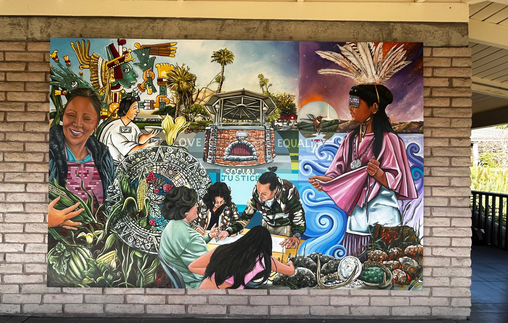 Created by artist Carlos Rodriguez with the support of Puente MaS students, this mural represents the need for student belonging on our campus, rooted in identity, culture and activism. The mural highlights the pride our students have in their Watsonville roots and their identity as indigenous, merchants, farmers and activists.